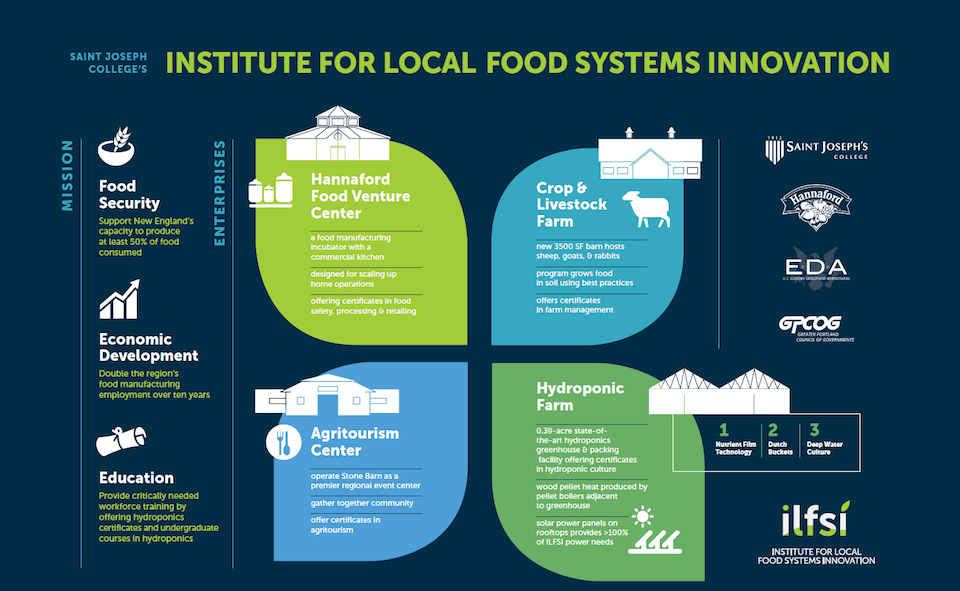 Later this year, Saint Joseph’s College will break ground for the one-third-acre hydroponic greenhouse of the Institute for Local Food Systems Innovation, and, soon thereafter, launch its first competency-based courses and certificate programs in hydroponic culture. The Institute consists of five enterprises: a food venture center, a hydroponic farm, a traditional crop and livestock farm, an agritourism event center, and an entrepreneurship development and educational program offering certificates in areas such as hydroponic farming, food processing, and food merchandising.