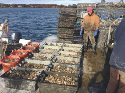 Lane’s experience hasn’t been restricted to one shellfish species, however. “I also worked on a mussel farm for about four years. The past couple of years I have shifted to working full time for Mark and helping to build his oyster farming business.” Lane refers to Mark Green’s business, known as Basket Island Oysters. He said, “We just got into scallop farming, too, last year. Seafood farmed with aquaculture only makes up a tiny percent of the market in the United States. Most of the seafood we eat in the States is imported. From a business point you don’t know how high it will go.